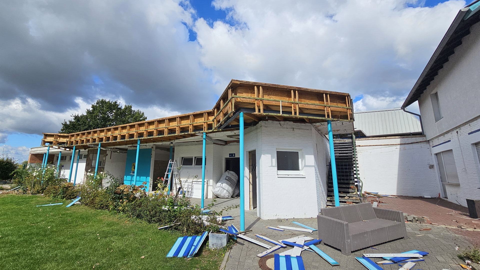 Derzeit sind die Holzarbeiten (neues, vergrößertes Vordach und neuer Technik Aufbau) im Gange.